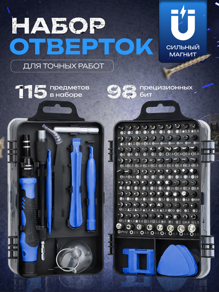 Набор отверток и бит 115 в 1 - это многофункциональный инструмент, который станет незаменимым помощником в быту, ремонте техники и электроники. Особенностью данного набора является его комплектация. В него входят удобная рукоятка-держатель с вращающейся опорной пяткой, гибкий и жесткий удлинители, а также 98 прецизионных бит всех основных типов. Это позволяет использовать набор для выполнения самых разнообразных задач, от ремонта электроники до работы с детскими игрушками. Удобство использования набора обеспечивается благодаря надежному магнитному креплению биты в держателе отвертки. В ручке отвертки есть реверсивный механизм с фиксацией, а магнитный наконечник в отвертке и магнитные биты делают пользование инструментом сплошным удовольствием. Набор отверток и бит 115 в 1 упакован в удобный компактный кейс-органайзер, где каждый элемент надежно фиксируется в своем слоте. Это обеспечивает удобство хранения и транспортировки инструмента. Все биты изготовлены из хромованадиевой стали, устойчивой к стиранию, окислению и коррозии. Это гарантирует долговечность и точность использования инструмента. Такой набор станет отличным подарком для любого мужчины, ценящего качество и функциональность. Комплектация: В набор отверток входят: - удобная рукоятка-держатель с вращающейся опорной пяткой - гибкий удлинитель - жесткий удлинитель - переходники - пинцет - устройство для извлечения sim-карт - пластиковые открыватели - присоска - устройство для намагничивания/размагничивания инструмента - 98 прецизионных бит всех основных типов: PH0000, PH000, PH00, PH0, PH1, PH2, PZ000, PZ00, PZ0, PZ1, PZ2, SQ0, SQ1, SQ2, G3.8, G4.5, SL1.0, SL1.3, SL1.5, SL2.0, SL2.5, SL3.0, SL3.5, SL4.0, M2.5, M3.0, M3.5, M4.0, M4.5, M5.0, M5.5, P2(0.8), P5(1.2), P6(1.5), P8(2.0), T1, T2, T3, T4, T5, T6, T7, T8, T9, T10, T15, T20, H0.7, H0.9, H1.0, H1.3, H1.5, H2.0, H2.5, H3.0, H3.5, H4.0, H4.5, H5.0, H6.0, T6H, T7H, T8H, T9H, T10H, T15H, T20H, T25H, Y0.6, Y1.5, Y2.0, Y2.3, Y3.0, U2.3, U2.6, U8, W2.0, SIM0.8, PH2.