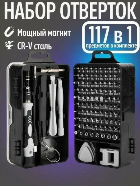 1: Набор отверток прецизионных 117 в 1 для точных работ в кейсе 2: Высокое качество, высокая производительность: эти прочные головки отверток изготовлены из стали CRV и имеют твердость HRC52 56, что гарантирует длительное использование. 3: Стабильный и простой в доступе: гибкий вал с регулируемой длиной 60 мм и дополнительный гибкий вал позволяют получить абсолютно недоступный винт, идеально подходит для стерео операции. Легко переносить, можно положить в дорожные сумки, машины или ящики для инструментов. 4: Набор магнитных отверток: Головка отвертки магнитная, изготовлена из ударопрочной инструментальной стали, прочной хромованадиевой стали, которые можно затянуть во время технического обслуживания, чтобы повысить производительность и сэкономить ваше время и усилия. 5: Широко используется: идеальный инструмент для ремонта iPad, телефона, планшета, ноутбука, ПК, смартфона, часов, очков, контроллера камеры PS4 / Xbox и других электронных устройств. В комплект поставки входят: • 90 x бит: • Phillips: PH000, PH000, PH00, PH00, PH0, PH0, PH1, PH1, PH2 и PH2 • M, Love, Bit: PZOO, PZOO, PZO, PZO, PZ1, PZ1, PZ2 и PZ2 • Прямые: 1,0, 1,5, 2,0, 2,5, 3,0, 3,5 и 4,0 • Прямые: 1/16, 5/64, 3/32, 7/64, 1/8, 9/64 и 5/32 • Пять звезд: 0,8, 0,8, 1,2, 1,2, 1,5, 1,5, 2,0 и 2,0 • Torx: T3, T3, T4, T4, T5, T5, T6, T6, T7, T7, T8, T8, T9, T9, T10, T15, T15, T20, И T20 • Шестигранник: 07, 0,9, 13, 1,3, 1,5, 1,5, 2,0, 2,0, Z5, 2,5, 3,0, 3,0, 3,5, 4,0 и 4,0 • Шестигранник: 1/16, 5/64, 3/32, 7/64, 1/8, 9/64 и 5/32Треугольник: 2,0, 2,3, 2,7 и 3,0«U» форма: 2,6 и 2,6 • Форма Y: 2,0 и 3,0 • Разъем 4 мм: M2.5, M3.0, M3.5, M4.0, M4.0, M4.5, M5.0 и M5.5Продукт Особенности: Материал: хром-ванадия + легированная сталь • Цвет: черный • Посылка включает в себя: 117 в 1 инструмент для демонтажа и ремонта