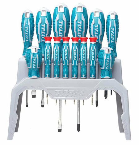 Набор отверток 14 шт. TOTAL THT250614 - большой универсальный комплект, который подходит для различных видов работ. В набор входят 4 отвертки для обслуживания крепежа с прямым шлицем, 4 отвертки с крестообразным шлицем и 6 миниатюрных отверток для точной работы с прямым, крестовым шлицем и TORX. Стержни намагничены. Валы инструментов изготовлены из хромованадиевой стали, не боятся коррозии и деформации. Удобные ручки изготовлены из нескользящего материала и оснащены отверстиями для подвешивания. Комплектация Шлицевые отвертки: SL4x100мм, SL5.5x100мм, SL6.5x38мм, SL6.5x150мм - 4 шт. Отвертки Phillips: PH0x75мм, PH1x100мм, PH2x38мм, PH2x150мм - 4 шт. Прецизионнвые отвертки 50 мм: SL1.5, SL2, PH000, PH00, T6, T8 - 6 шт. Тип инструмента набор отверток Кол-во предметов в наборе, шт 14 Материал хромованадиевая сталь (Cr-V) Материал рукоятки пластик с прорезиненным покрытием Параметры товара в упаковке Габариты 360 x 293 x 35 мм Вес нетто: 1,1 кг