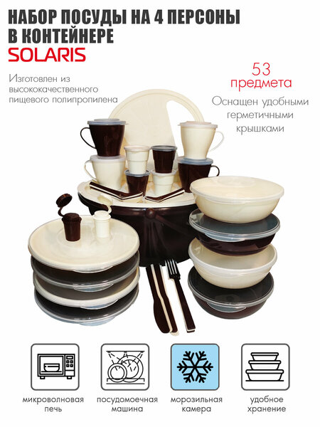 Набор многоразовой посуды SOLARIS изготовлен из высококачественного ударопрочного пищевого полипропилена, включает в себя 11 наименований столовых принадлежностей. В набор входят 1разделочная доска, 4 универсальные миски 0,6л для супа/салата, 4 тарелки 180мм, 4 чашки 0,4л, 4 стаканчика 100гр с мерными делениями, солонка, перечница, 4 комплекта столовых приборов, состоящих из ножа, вилки, столовой и чайной ложек. Входящие в комплект герметичные крышки обеспечат гигиеничное хранение любых видов продуктов. Набор компактно упакован в удобный пластиковый контейнер 9л с ручкой и крышкой. Контейнер можно использовать как корзину для переноски продуктов, сбора грибов и ягод. Для поездки на пикник - как для посуды, так и для продуктов. В нем можно замариновать шашлык, засолить овощи, заквасить капусту. Продукты в контейнере, закрытом крышкой, долго сохранят свежесть и температурный режим. Также в контейнере можно хранить пряжу для вязания, изделия для шитья, бытовую химию, стиральные порошки, баночки с красками, кисти, различные хозяйственные мелочи и инструменты. Овальную крышку от контейнера можно использовать в качестве блюда или подноса. Эта посуда чрезвычайно практичная. Она лёгкая, прочная, износостойкая и удобна в использовании, её можно мыть в посудомоечной машине, использовать микроволновой печи и морозильной камере. Набор идеально подойдет для пикника, похода, охоты или рыбалки, его часть удобно взять с собой в роддом, командировку или путешествие. Стол, сервированный этой изящной посудой, будет стильным, и послужит отличным подарком как для друзей и близких, так и для коллег по работе, а также станет нужным и полезным спутником для любителей активного отдыха и автопутешествий. Сделано в России. Комплектация набора посуды на 4 персоны ванильно-шоколадный: Контейнер 9, 0л с крышкой - 1 шт; Разделочная доска овальная – 1 шт; Тарелка 180мм с крышкой – 4 шт; Миска 0,6л с крышкой – 4 шт; Чашка 0,4л с крышкой – 4 шт; Стаканчик 0,1л с мерными делениями с крышкой – 4 шт; Вилка – 4 шт; Ложка столовая – 4 шт; Нож – 4 шт; Ложка чайная – 4 шт; Солонка/перечница – 2 шт.