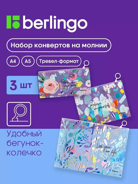Набор из трех папок конвертов для документов и бумаг на молнии Berlingo серии Style станут стильным аксессуаром в учёбе и работе. Форматы A4 (335*245 мм), A5 (240* 182 мм), Travel size (255*137 мм) подходят для размещения до 100 листов. Папки изготовлены из высококачественного полипропилена плотностью 180 мкм с матовой текстурой поверхности «апельсиновая корка», на которой не видно отпечатков пальцев и мелких царапин. Пластиковые конверты предназначены для хранения и транспортировки бумаг. Папки имеют горизонтальную ориентацию. Благодаря надежной молнии с мягким ходом и удобным бегунком-колечком, все ваши важные документы останутся в полной сохранности, без повреждений и загрязнений. Стильный дизайн изделия понравится ценителям минимализма и добавит элегантности вашему деловому образу. Набор из 3 папок на молнии- это удобство и функциональность в каждой детали!