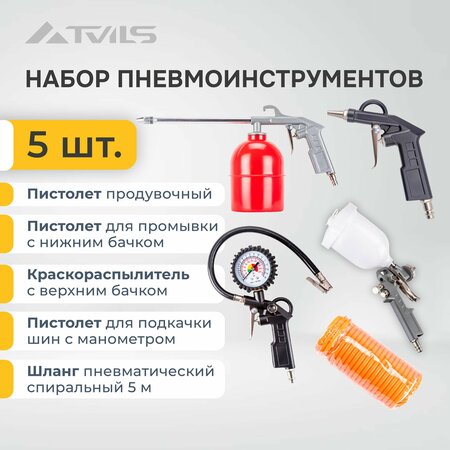 Набор из 5 пневмоинструментов для воздушных компрессоров - это универсальный комплект для бытового использования, который можно широко использовать в мастерской, на даче и в загородном доме. Автолюбителям данный комплект также пригодится в гараже для выполнения различных операций, таких как: покрасочные работы, нанесение антикоррозионного покрытия, промывка и продувка деталей от грязи и пыли, подкачка шин и т.п. Все аксессуары для удобства оснащены быстросъемными разъемами Rapid и отличаются высоким качеством и надёжностью. Состав комплекта: 1. Пистолет продувочный - материал корпуса алюминий, cоединение Rapid M ("папа") 2. Пистолет для промывки с нижним бачком 0,7 л.- материал корпуса алюминий, cоединение Rapid M ("папа") 3. Краскораспылитель с верхним бачком 0,5 л.- материал корпуса алюминий, сопло 1,5 мм, cоединение Rapid M ("папа") 4. Пистолет для подкачки шин с манометром 60 мм - материал корпуса алюминий, шланг с прищепкой 30 см, макс. давление 12 бар, cоединение Rapid M ("папа") 5. Шланг пневматический спиральный 5 м, материал - полиэтилен, обжат быстросъёмными фиттингами Rapid М ("папа") - Rapid F ("мама"). особенности: