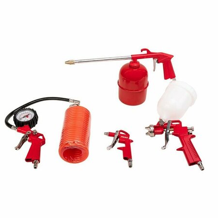 каскораспылитель с верхним пластиковым бачком объемом 600 мл., пистолет для промывки и смазки, шланг спиральный воздушный 5м., пистолет для подкачки шин с манометром, пистолет для продувки