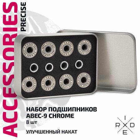 Набор высокоточных хромированных подшипников Precise, ABEC-9 Chrome – универсальная расходная часть для самокатов, роликов и бордов. ABEC-9 – самая высокая степень точности изготовления. Такие подшипники отличаются долговечностью и гарантируют лучший накат. Precise позволит с легкостью заменить вышедшие из строя запчасти. Комплект состоит из 8 подшипников ABEC-9 и 4 спейсеров. Высокоточная обработка стальных тел качения (шариков) по международному стандарту обеспечивает отличную скорость и продолжительный накат. Precise позволяют колесам крутиться бесшумно, а также легко выдерживают высокое давление и температуру. Подшипники закрыты с двух сторон, поэтому дольше сохраняют смазку и свои эксплуатационные свойства. Удобный металлический кейс для транспортировки и хранения входит в комплект. Преимущества: ABEC-9 подшипники с лучшей производительностью; Простой монтаж; Высокоточная обработка; Соответствие международному стандарту; Закрыты с двух сторон; Металлический бокс для хранения в комплекте. Характеристики: Материал: сталь В комплекте: ABEC-9 Chrome подшипник - 8 шт, спейсер - 4 шт. Внутренний диаметр подшипника, мм: 8 Наружный диаметр подшипника, мм: 22 Тип упаковки: металлический короб Страна производства: Китай