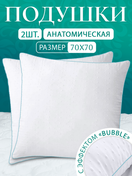 Набор подушек для сна 70х70 см: анатомическая и гипоаллергенная Подушка Bubble - это сочетание современных технологий. Чехол изготовлен из приятной на ощупь, легко пропускающей воздух микрофибры с оригинальной тисненой фактурой. Роскошное 3D массажное пузырьковое покрытие обеспечивает сверхмягкое ощущение и массажный эффект. Мелкие шарики на поверхности ткани создают дополнительный объем и препятствуют скольжению. Анатомическая форма и средняя степень поддержки Набор подушек для сна 70х70 см предлагает анатомическую форму, которая обеспечивает оптимальную поддержку головы и шеи во время сна. Средняя степень поддержки позволяет вам чувствовать себя комфортно и расслабленно, обеспечивая качественный отдых. Гипоаллергенный наполнитель и материал чехла Наполнитель из силиконизированного волокна обеспечивает мягкость и комфорт, а также долговечность. Материал чехла из микрофибры делает подушку мягкой и приятной на ощупь, а также легко чистится и стирается. Белый цвет и стильный дизайн Подушки имеют стильный белый цвет, который легко впишется в любой интерьер и станет ярким акцентом в вашей спальне. В наборе 2 подушки размером 70х70 см, что позволяет вам выбрать наиболее удобную сторону для сна. Выбирая набор подушек для сна 70х70 см, вы получаете комфортный и качественный сон, а также заботу о своем здоровье и комфорте.