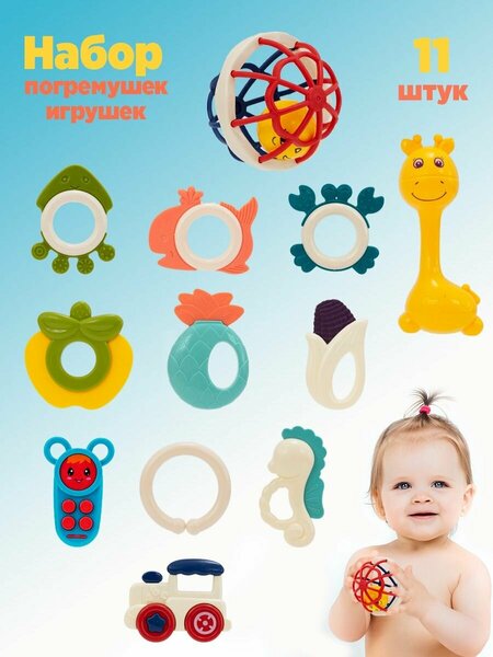 Набор погремушек и прорезывателей 11 шт в упаковке. Когда малыш еще совсем маленький – первая игрушка, которая попадает к нему в ручки это погремушка. Именно с нее он начинает знакомства с внешним миром, поэтому очень важно выбрать качественные погремушки, чтобы не навредить ребенку. Набор погремушек и прорезывателей в упаковке включает в себя 11 игрушек-погремушек со звуковыми эффектами и элементами из мягкой резины. Изделия имеют яркие цвета и необычную форму. Погремушки подвесы и грызунки выполнены в виде фигурок морских животных рыбки овощей жирафика. Внутри погремушек перекатываются шарики и издают звук-треск, который точно привлечет внимание девочки или мальчика. Также в комплекте имеется кольцо на которое можно собрать прорезыватели и подвесить их на коляску кроватку автокресло. Интерактивные потешки - погремушки прекрасно подходят для развития основных, первичных навыков новорожденного: концентрация внимания, тактильное зрительное и слуховое восприятие, общая координация движений и развитие мелкой моторики(по методике Монтессори). Прорезыватели для зубов имеют мягкий силиконовый элемент, который бережно массируют десна младенцу. Небольшой размер развивающих изделий идеально подходит для детских ручек, поэтому крохе будет удобно их держать, одевать на пальчики или запястье. Яркий подарочный набор выполнен из высококачественного пластика, поэтому полностью безопасен для детей. Набор обучающих игрушек станет неотъемлемой частью и отличным подарком ребенку 0+ 1+ 3+ дочке сыну внуку внучке крестнице на 8 марта 23 февраля день рождение новый год крестины.