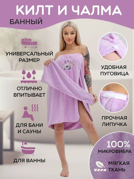 Банный набор женский - идеальный выбор для тех, кто любит расслабляться в бане или сауне. Килт и чалма – особые банные принадлежности были специально созданы для обеспечения максимального комфорта и уюта во время посещения бани, сауны или хаммама. Килт женский представляет собой элегантный сарафан, выполненный из микрофибры высокого качества. Этот материал обладает мягкостью, плотностью и отличной впитывающей способностью. Он не вызывает раздражения на коже, быстро сохнет и хорошо пропускает воздух, что особенно важно во условиях повышенной влажности. Килт не сковывает движения и не мнется, что обеспечивает его удобство и практичность. Он может быть использован не только во время банных процедур, но и как замена домашней одежде, халату или парео для отдыха на пляже или у бассейна. Верхняя часть килта имеет резинку и надежную фиксацию в виде липучки, которые позволяют ему подстроиться под любую фигуру и обеспечить идеальную посадку. Комплект также включает в себя чалму, которая защитит ваши волосы от пересушивания и высоких температур. Эта шапочка будет надежным спутником в сауне, SPA-салоне или дома, быстро высушивая ваши волосы без вреда для их структуры. Вся одежда – тюрбан и килт - с вышивкой в виде цветов, которые делают эти аксессуары для бани особенно женственными. Вы забудете про громоздкие и тяжелые махровые банные полотенца. Брать такой банный комплект в поездки одно удовольствие, он не занимает много места и практически невесом. Дизайн комплекта подходит для женщин любого возраста. Он станет прекрасным подарком для вашей жены, мамы или сестры на любой праздник или просто так. Набор сочетает в себе практичность и функциональность, и обязательно порадует каждую женщину, которая заботится о себе.