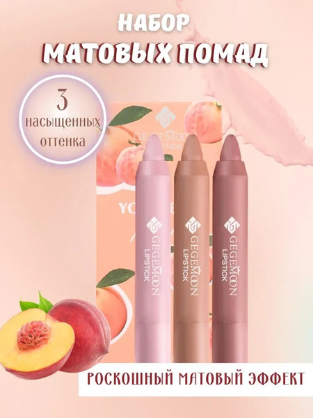 Набор матовых помад с 3 оттенками! Каждый карандаш для губ - находка для любительниц, создающий привлекательный контур для губ. Макияж созданный яркими матовыми оттенками давно уже стал трендом. С набором супер трендовых бархатистых тинтов от Gegemoon Lipstick твой образ будет неповторимым! Губная матовая кремовая помада-карандаш подарит чёткий контур, насыщенный цвет, деликатный блеск и питание. Подходят для создания нежного дневного макияжа ярких оттенков. Текстура: плотная кремовая. Финиш: матовый. Стойкость: до 6 часов. Основные преимущества: - Ровно ложится на губы; - Обладает увлажняющим эффектом; - Разглаживает поверхность кожи и сохраняет ее эластичность; - Удобный механизм. Продукт не сушит губы и не подчеркивает шелушения. Средство заменит масло для губ или гигиенические помады. Активные компоненты, содержащиеся в составе помады обволакивают кожу, не забиваясь в поры, придают им ухоженный и соблазнительный вид. Продукт имеет послевкусие клубники, со вкусом персика, Вишней и авакаду. Созданная на основе оптимального сочетания воска, оливкового и касторового масла, женская увлажняющая суперстойкая, бархатистая, кремовая помада-стик прекрасно воздействует на губы, сохраняя красоту и придавая естественный объем. Порадуйте свои губы потрясающим цветом! Спасибо, что выбрали наш магазин! Больше актуальных и топовых товаров вы можете отследить, подписавшись на нас.