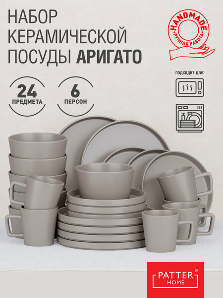 Набор тарелок на 6 персон "Аригато" серого матового цвета - идеальное решение для создания элегантного и стильного столового сервиза. Этот набор столовой посуды серый состоит из двадцати четырех предметов, каждый из которых является незаменимым элементом при сервировке стола для обеденного или ужинного приема. Каждая тарелка из столового сервиза на 6 персон изготовлена из высококачественного каменной фарфоровой керамики, что придает ей особую прочность и долговечность. Фарфоровый материал обеспечивает не только эстетическое удовольствие при использовании, но и устойчивость к повреждениям и царапинам. Элегантный и роскошный вид, который будет привлекать внимание гостей и создавать особую атмосферу в столовой. Невероятно красивый набор тарелок приятного серого цвета на 6 персон сделает прием пищи не только вкусным, но и визуально приятным. Комплект посуды сочетает всё самое лучшее – каменная фарфоровая керамика, экологичность, сохранение тепла, высокая ударопрочность и возможность применения в посудомоечной машине и микроволновой печи! Набор включает все самые необходимые столовые принадлежности. Целых 18 тарелочек и 6 чашек в наборе закрывают все потребности на кухне. Посуда полностью универсальная. Можно применять для завтрака, обеда и ужина. Столовый сервиз из керамики включает в себя шесть тарелок разного размера, что позволяет использовать их для различных видов блюд. Большая тарелка идеально подойдет для сервировки основных блюд, а средняя и маленькая тарелки подойдут для представления закусок, салатов или десертов. Это позволяет создать гармоничное и стильное сочетание на столе. Этот набор тарелок на 6 персон также может служить великолепным подарком для друзей или близких. Его стильный и элегантный дизайн придаст особый шарм любому интерьеру и станет прекрасным украшением для столовой или кухни. Неотъемлемой частью современного дома является качественная и стильная посуда. Набор тарелок на 6 персон объединяет в себе все необходимые качества для создания уютной и гостеприимной атмосферы в вашей столовой. Он подчеркнет вашу индивидуальность и станет незаменимым аксессуаром для вашего дома. Кушайте с удовольствием вместе с невероятно красивым набором посуды из 18 тарелок и 6 кружек! Также в нашем ассортименте есть столовые сервизы на 4 и 6 персон красивого глянцевого светло-серого и бирюзового цвета, а также наборы кружек к наборам посуды. Комплектация Тарелки для вторых блюд – 25 см – 6 шт. Тарелки для салатов и дессертов – 19,5 см – 6 шт. Тарелки для супа – 15 см – 6 шт. Кружки для чая и кофе, 355 мл, высота 9,5 см - 6 шт. итого: 24 предмета