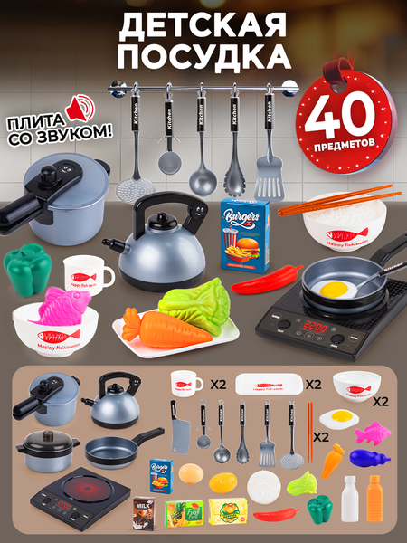 Игрушечная посуда для детей — веселый подарок и развивающая игра! Этот набор из 40 предметов поможет разнообразить игровые сценарии и развивать полезные навыки. В комплекте: игрушечная детская посуда, игрушечная еда, интерактивная плита со звуковыми эффектами и аксессуары для создания полноценных игровых сценариев. Посуда: чайник, кастрюля с крышкой, сковорода, пароварка с крышкой. Набор кухонных принадлежностей. Плита со звуком: левая кнопка имитирует жарку, правая — бурление. Работает от 3 батареек типа АА (не входят в комплект). Сервировка: 2 подноса, 2 глубокие тарелки, 2 чашки, 4 палочки для еды. Игрушечная еда: перец, морковь, рыбка, картошка, зеленый перец, салат, яйцо, баклажан, рис, яичница, 2 бутылочки и картонные коробочки с продуктами. Яркие цвета и реалистичный дизайн сделают игру увлекательной как для одного ребенка, так и для компании. Набор можно брать в гости, детский сад или использовать дома. Почему этот набор — лучший выбор? Безопасность и долговечность. Изготовлен из прочного безопасного пластика, легко моется и не боится царапин. Интерактивность. Плита с реалистичными звуками жарки и бурления добавляет эмоций в игры. Развивающие игры. Помогает развивать мелкую моторику, воображение и навыки общения. Сервировка стола, готовка еды и ролевые игры учат простым бытовым навыкам. Универсальность. Идеально подходит как для девочек, так и для мальчиков. Дополнительные преимущества: Рекомендуется для детей от 3 лет. Небольшие размеры игрушек развивают мелкую моторику. Набор упакован в прочную коробку, которая защищает игрушки при транспортировке. Совместим с другими игрушечными кухнями и аксессуарами. Этот набор станет отличным подарком на Новый год, день рождения или любой другой праздник. Надолго увлечет ребенка, развивая полезные навыки в игровой форме.