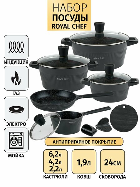 Набор посуды для приготовления кастрюли и сковорода Royal Chef 12 предметов. Цвет черный.