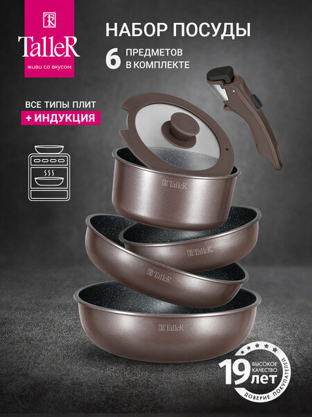 Набор посуды Taller — стильное и функциональное решение для вашей кухни! В набор входят три сковороды разного размера: сковорода 20 см, сковорода 24 см, глубокая сковорода 26 см, ковш 2 л с крышкой, а также универсальная съемная ручка, благодаря которой посуда занимает минимум места. Дно толщиной 3,5 мм с индукционным диском обеспечивает равномерный нагрев. Данный набор посуды — универсальный комплект для приготовления разнообразных блюд. Набор посуды подходит для всех типов плит, включая индукционные. Корпус из литого алюминия гарантирует долгий срок службы и стильный внешний вид, а двухслойное антипригарное покрытие защищает от пригорания, облегчая процесс мытья и делая посуду долговечной. Рекомендуется ручное мытье для сохранения красоты и долговечности посуды. Погрузитесь в мир кулинарных экспериментов с этим универсальным набором кухонной посуды — он станет вашим надежным помощником в создании вкусных блюд и добавит ярких красок в каждое приготовление!