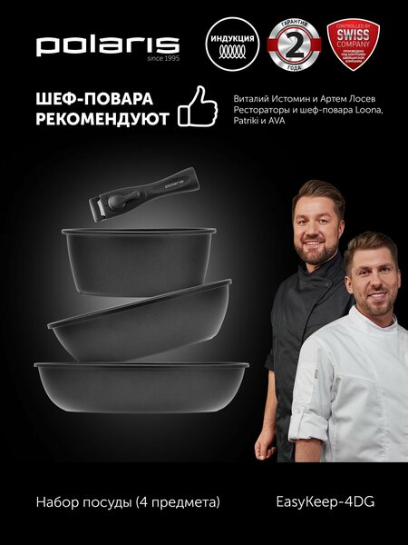Набор Polaris EasyKeep-4DG - это идеальный выбор для тех, кто ценит грамотное хранение и универсальность кухонной посуды. Серия Easy Keep 4DG - это не только эстетичный внешний вид и современный дизайн, но и многофункциональность! Вся продукция от Polaris известна своей надежностью, долговечностью и соответствует высочайшим европейским стандартам качества. Профессиональные кухонные принадлежности изготовлены из прочного и качественного материала - кованого алюминия. Алюминиевая посуда намного легче и практичнее в уходе, чем изделия из чугуна и нержавеющей стали. Высокопрочное антипригарное покрытие DIAMANT 3X с добавлением алмазной крошки, обеспечивает долгую эксплуатацию и сохранность уникальных вкусовых качеств приготовленных блюд. Покрытие DIAMANT 3X - позволяет посуде дольше сохранять свои антипригарные свойства и обладает максимальной стойкостью к внешним нагрузкам. Это обеспечивает максимальную долговечность изделий в отличие от посуды с каменным покрытием. Съемная бакелитовая ручка обладает двойной защитой, что обеспечивает надежную сцепку с посудой и гарантирует легкость в эксплуатации. Эргономичный держатель не скользит и не нагревается в отличие от ручек из пластика. В универсальный комплект из 4-х предметов входит: маленькая сковорода (диаметр 24см), большая сковородка (диаметр 26см), съемная ручка, глубокий ковш (диаметр 18 см). Столовая утварь подходит для использования на индукционной, электрической, керамической и газовой плите, а также для запекания в духовке. Воздушные пироги, сочное прожаренное мясо, полезные тушёные овощи и картофель, суп и лапша, - все это без труда можно приготовить с коллекцией профессиональной посуды EasyKeep4DG. Ведь она идеально подходит для жарки, варки, тушения и запекания любых продуктов. Приборы для кухни неприхотливы в уходе: легко моются как вручную, так и в посудомоечной машине. Набор Polaris - идеальное сочетание высокого качества и элегантности!
