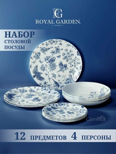Набор посуды Royal Garden Blue Birds– сервиз столовый, рассчитанный на 4 персоны. Дизайн тарелок вдохновлён природными мотивами. Рисунок сочетает в себе растительные и анималистичные элементы. Разнообразие размеров и форм позволяет каждому гостю выбрать тарелку, подходящую именно ему. Используйте большие обеденные тарелки для подачи горячего, а также для сервировки закусок. Тарелки глубокие можно использовать по их прямому назначению для подачи супов, а также для сервировки салатов и рассыпчатых горячих блюд из круп (плов, булгур, ризотто). Десертные тарелки подходят для подачи тортов, фруктов или порционной раздачи салатов. При выборе набора посуды обратите внимание на материал изготовления. Стеклянные тарелки лёгкие и прочные, устойчивые к царапинам, что делает их идеальным выбором для повседневного использования. Набор тарелок, изготовленный из опалового стекла, создается путем плавления минералов. Полученная масса раскатывается в тонкие листы толщиной 3 мм. Листы стекла обжигают, а затем равномерно остужают, что позволяет добиться повышенной прочности посуды. Глянцевая поверхность абсолютно гладкая, без пор, что препятствует скоплению микрочастиц пищи, а значит сервиз столовый защищен от бактерий и налёта. Тарелки не впитывают аромат, цвет или жидкость, а значит безопасны и подходят даже для использования в домах с маленькими детьми.