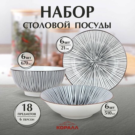 Сервиз столовый из керамики на 6 персон 18 предметов. Набор столовой посуды включает: набор тарелок тарелки керамические обеденные круглые плоские белые в черную полоску классической формы 21см для второго - 6 шт, набор салатников салатник миска салатница полукруглой формы белый в черную полоску 670мл 15см - 6 шт, тарелки глубокие для первого белые в черную полоску 17см 510мл - 6 шт. Сервиз столовый обеденный универсален и удобен. Тарелка плоская подойдет для второго и нарезки; салатники полукруглой формы подойдут для салата и как порционная салатница, миска для шурпы; тарелки для супа подойдут для первого, салата, бульона, окрошки, миска для каши. Набор тарелок плоских для второго выполнен в классической форме столовой посуды, с углублением в центре плоской тарелки. Салатница с округлым дном, вместительная и глубокая. Тарелка для супа с округлым дном, форма расширяющаяся к кромке. Сервиз обеденный выполнен из керамики средней толщины, прекрасно подойдет для дачи и загородного дома. Набор посуды для сервировки стола в едином стиле станет приятным и полезным подарком для мужчины и женщины, в качестве подарка на 14 февраля День Святого Валентина, 8 марта, день Рождения, Новый год, Юбилей или годовщину маме, папе, мужу, жене, детям, бабушке, дедушке, сестре, брату, родственникам, друзьям, другу, подруге, коллеге, учителю, знакомым, девушке, любимому человеку или в качестве корпоративного подарка. Обеденный сервиз белый из фарфора можно мыть в посудомоечной машине и использовать в СВЧ
