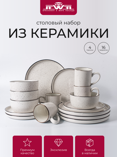 Столовый сервиз JEWEL «Глория» (16 предметов, керамика, светло-серый, на 4 персоны) — это стильный и современный сервиз столовый, который объединяет практичность, надёжность и элегантный дизайн. Такой столовый сервиз на 4 персоны станет гармоничным решением как для ежедневных обедов, так и для праздничной сервировки. Состав набора: обеденная тарелка 27 см -4 шт, тарелка 21см - 4 шт, салатник 15см/750мл - 4 шт, кружка 400 мл - 4 шт. Изготовленный из прочной керамики, этот сервиз керамический отличается долговечностью, безопасностью и удобством. Все элементы можно мыть в посудомоечной машине и использовать в СВЧ, что делает набор особенно практичным. Преимущества: •полный столовый набор посуды для семьи из 4 человек; •универсальность: это и обеденный сервиз, и чайный сервиз; •практичность: посуда легко очищается и выдерживает нагрев в микроволновке; •современный лаконичный дизайн. JEWEL «Глория» — это посуда набор столовый, который подчеркнёт ваш вкус и станет основой домашней коллекции.