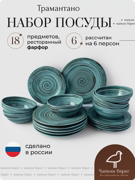 Набор посуды столовой на 6 персон, 18 предметов, ресторанный фарфор, коллекция Трамантано. В комплект входит всё необходимое для ежедневного использования. Полноценные большие суповые тарелки диаметром 15,5 см. Обеденные плоские тарелки могут также использоваться как подстановочные. Десертные тарелки не сильно маленькие, их можно использовать и для основных блюд. Практичность такой посуды доставит удовольствие и комфорт как при ежедневном использовании, так и по особым случаям. Посуда изготовлена из толстостенного фарфора с усиленным краем для большей устойчивости к ударам и сколам. Российское производство. Тарелки можно мыть в посудомоечной машине и использовать в микроволновой печи. Сервиз выполнен из экологичных материалов, имеет российские сертификаты качества.