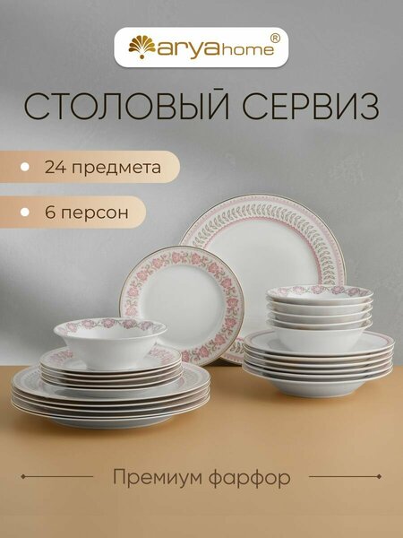 Столовый сервиз на 6 персон Carmine – красивая и качественная посуда, которая станет украшением повседневной и праздничной сервировки! Набор от бренда «Arya home collection» включает 24 предмета (по 6 штук каждого вида). Глубокая тарелка диаметром 21,5 см отлично подойдет для подачи первых блюд. Салатник диаметром 15,5 см удобен для сервировки салатов. На плоской обеденной тарелке 27 см можно подать холодные закуски, мясо и рыбу, пасту и другие вторые блюда. Десертные тарелочки диаметром 19 см отлично подходят для сервировки сладких десертов или тарталеток. Посуда выполнена из 100% костяного фарфора. Она представлена в белом цвете и украшена оригинальным розовым орнаментом и золотистой окантовкой по периметру. Универсальный комплект эстетичных тарелочек круглой формы станет приятным и полезным презентом на новоселье. Подарочный кухонный инвентарь можно вручить молодоженам. Подарите его родителям на годовщину свадьбы или любимому учителю и руководителю на юбилей. Приборы обрадуют бабушку с дедушкой и маму с папой. Они обязательно понравятся сестре и подружке. Это отличный выбор для сервировки горячих и холодных блюд. На выполненных в едином стиле тарелочках можно подать суп и кашу, нарезку из сыра с колбасой или фруктов, плов и многое другое. Фарфоровую интерьерную посуду по достоинству оценят все члены семьи! Она понравится взрослым мужчинам и женщинам, девушкам и парням. Это интересный и желанный подарок для жены с мужем, дочери или крестной. Интересный сервиз станет милым презентом на мужской и женский день рождения. Суповые, обеденные и десертные тарелки, а также салатницы можно мыть в посудомоечной машине (ПММ) на специальном деликатном режиме, но их НЕЛЬЗЯ использовать в микроволновой печи. Это классика, которая украсит домашний интерьер в любом стиле. В коллекции нашего бренда вы найдете сервизы с различными трендовыми дизайнами, которые станут хорошим выбором для дома и квартиры. У нас есть акции и распродажи, вы можете купить наши товары в подарок со скидкой!