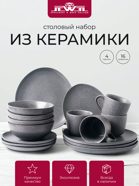 Столовый сервиз JEWEL «Грей» — это безупречное сочетание изысканного дизайна, практичности и высочайшего качества. Этот сервиз столовый на 4 персоны включает 16 предметов, созданных для полной и гармоничной сервировки стола: 4 обеденные тарелки диаметром 26,5 см, 4 плоские (суповые) тарелки диаметром 21 см, 4 салатника диаметром 16,5 см и 4 кружки объёмом 340 мл. Такая продуманная комплектация делает обеденный сервиз универсальным решением — он подойдёт как для повседневных завтраков и обедов, так и для торжественных ужинов. Сервиз из керамики изготовлен из высококачественного материала, что гарантирует его прочность, устойчивость к перепадам температур и долговечность в ежедневном использовании. Его благородный серый цвет с тонкими светло-серыми вкраплениями создаёт эффект натурального камня, а абстрактный дизайн придаёт изделию современную выразительность. Круглая форма тарелок подчёркивает классические пропорции, обеспечивая эстетичную и симметричную подачу блюд. Столовый сервиз на 4 персоны — это идеальный выбор для небольшой семьи, романтического вечера или дружеской встречи. Компактный, но полноценный, он экономит место в шкафу, не уступая в функциональности. Обеденные тарелки вместительны для горячих блюд, суповые — идеальны для первых блюд, салатники — для закусок и гарниров, а кружки — для кофе, чая или других напитков. Сервиз 16 предметов — это не просто набор посуды, а продуманная система, которая делает каждый приём пищи комфортным и стильным. Этот сервиз серый органично впишется в любой интерьер — от лаконичного скандинавского до утончённого классического. Он не требует дополнительного декора: его сдержанная эстетика сама по себе создаёт атмосферу уюта и гостеприимства. Столовый сервиз JEWEL «Грей» — это инвестиция в повседневную радость, в визуальное удовольствие от сервировки, в удовольствие от каждого глотка и каждого кусочка. Выбирая этот обеденный сервиз, вы выбираете не просто посуду — вы выбираете стиль жизни. Он станет достойным украшением вашего дома и прекрасным подарком для близких — тем, кто ценит качество, эстетику и внимание к деталям. Сервиз столовый, сервиз обеденный, сервиз серый, сервиз из керамики — всё это в одном изысканном решении, созданном для того, чтобы радовать вас каждый день.