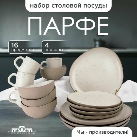 Столовый сервиз "Парфе" 16 предметов бренда JEWEL. Керамический набор посуды - это идеальное решение для тех, кто ценит высокое качество и оригинальный дизайн. Кухонная керамическая посуда экологически безопасна, не вызывает аллергии, имеет привлекательный внешний вид. Наружная поверхность сервиза шероховатая. При бережном отношении такая посуда может прослужить довольно долгое время. Этот обеденный сервиз на 4 персоны идеально подойдет как для вашего дома, так и для ресторанов. В состав столового сервиза: