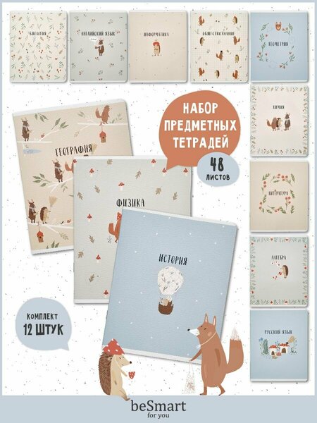 Перед вами комплект из 12 штук школьных тетрадей beSmart на скобах, которые легко обеспечат комфорт и удовольствие от учебного процесса! Каждая тетрадь 48 листов в клетку или линейку имеет удобный формат А5 (165х203 мм), что делает их компактными и портативными. Обложки на скрепке изготовлены из мягкого, но прочного ламинированного картона, что гарантирует долговечность и защиту внутренних страниц. Кроме того, они украшены уникальной печатью для каждого предмета, которая добавляет стиль и индивидуальность. А скругленные уголки позволят мягкой обложке дольше сохранять первозданный вид. Внутренние блоки в синюю клетку или линейку со стандартными красными полями и скругленными уголками на 48 листов (96 страниц) из высококачественной бумаги белизной 100% и плотностью 60 г/м2 имеют титульные листы, на которых вы сможете указать свое имя, класс или другую необходимую информацию. Это очень полезно для школьников, чтобы не потерять свою тетрадь и легко ее идентифицировать. Каждая тетрадка имеет нужный справочный материал по предмету. Плюс, на обложке вы найдете QR-код, по которому справочный материал откроется и онлайн! Набор тетрадей по основным предметам предлагает вам сочетание высокого качества, удобства и стильного дизайна. Красивые предметки в клеточку или линеечку А5 станут надежными помощниками для мальчиков и девочек в записях уроков и выполнении заданий. Дополнив эти тетради подходящими ручками и карандашами, папками и пеналами, вы получите идеальный подарочный набор для детей на 1 сентября или просто быстро соберете ребенка в школу. Ведь широкая линейка разнообразных дизайнов на любой вкус позволит вам собрать свой уникальный набор тетрадей и блокнотов, а так же подобрать канцелярские принадлежности к ним! beSmart - это самая эстетичная канцелярия и бумажная продукция для школы, института и офиса!