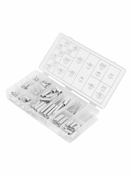Пластиковый кейс 1 шт Пружины растяжения: 4х79,5 мм 12 шт 4,5х44,5 мм 8 шт 5х20,4 мм 10 шт 5,5х25,5 мм 10 шт 6,5х22 мм 10 шт 7х38 мм 10 шт 7х51 мм 12 шт 8х28,5 мм 8 шт 8х31,5 мм 10 шт 8х44,5 мм 12 шт 8,5х36,5 мм 10