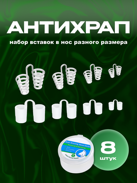 В состав ходят 8 вставок, которые помогают облегчить дыхание через нос. Они нежно расширяют ноздри, обеспечивая свободный поток воздуха в дыхательные пути. Комплект состоит из 4 вставок-трубок и 4 вставок-сеток различных размеров: очень большой, большой, средний и маленький. Вставки-антихрап хранятся в герметичном футляре. Футляр компактен и не пропускает воздух и жидкости, поэтому силикон не ссохнется, а вставки не испачкаются. Перед использованием нужно очистить нос, затем вставить одну из вставок перед сном. После использования промыть теплой водой с мылом, просушить при комнатной температуре. Материал изделий - медицинский силикон (4шт), пластик (4шт).