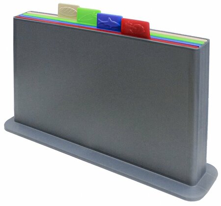 Набор включает 4 разделочные доски, выполненные из прочного, безопасного для контакта с пищей пластика. Доски из пластика являются одними из самых долговечных. Они устойчивы к деформации, не разрушаются, а кроме того, не скользят по поверхности стола, что обеспечивает безопасную нарезку продуктов. Доски имеют разные цвета и специальные ярлычки, что позволяет использовать доску определенного цвета для определенного вида продуктов. Каждая доска предназначена для своего вида продукта в соответствии с ярлыком (хлеб, рыба, овощи, мясо). Доски хранятся в специальной подставке что позволяет экономить пространство на кухне.