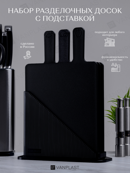 Набор разделочных досок ST VANPLAST: функциональность и удобство Набор разделочных досок ST VANPLAST представляет собой практичный и стильный аксессуар для Вашей кухни. В комплекте Вы получаете три разделочные доски размером 23,3х19,8 см каждая, а также удобную подставку для их хранения. Двухсторонняя конструкция досок позволяет использовать их с обеих сторон, что значительно продлевает срок службы и экономит место на Вашей кухне. Доски изготовлены из пищевого пластика, который не впитывает запахи и легко моется в посудомоечной машине. Это обеспечивает гигиеничность и удобство использования, а также позволяет поддерживать чистоту на Вашей кухне. В комплекте с досками идет удобная подставка, которая позволяет хранить их в одном месте и обеспечивает порядок на рабочей поверхности. Выбирая набор разделочных досок ST VANPLAST, Вы получаете не только стильный и практичный аксессуар для Вашей кухни, но и надежный инструмент для приготовления пищи, который прослужит Вам долгое время.