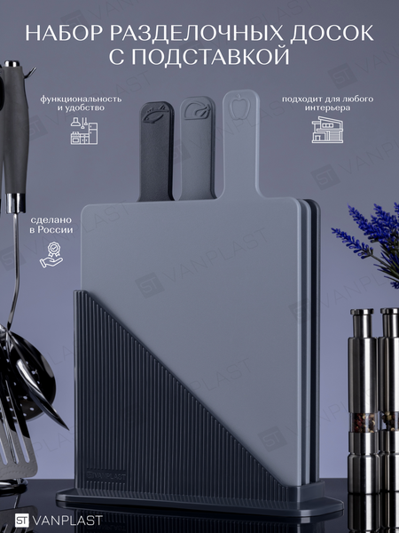 Набор разделочных досок ST VANPLAST: функциональность и удобство Набор разделочных досок ST VANPLAST представляет собой практичный и стильный аксессуар для Вашей кухни. В комплекте Вы получаете три разделочные доски размером 23,3х19,8 см каждая, а также удобную подставку для их хранения. Двухсторонняя конструкция досок позволяет использовать их с обеих сторон, что значительно продлевает срок службы и экономит место на Вашей кухне. Доски изготовлены из пищевого пластика, который не впитывает запахи и легко моется в посудомоечной машине. Это обеспечивает гигиеничность и удобство использования, а также позволяет поддерживать чистоту на Вашей кухне. В комплекте с досками идет удобная подставка, которая позволяет хранить их в одном месте и обеспечивает порядок на рабочей поверхности. Выбирая набор разделочных досок ST VANPLAST, Вы получаете не только стильный и практичный аксессуар для Вашей кухни, но и надежный инструмент для приготовления пищи, который прослужит Вам долгое время.