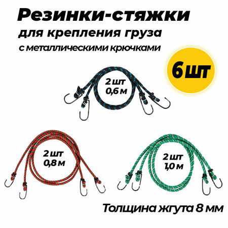 Набор резинок для грузов с металлическими крючками: надежное крепление и защита багажа Набор эластичных резинок (жгутов) надежно закрепляет багаж и защищает его от повреждений при перевозке. Применяются как в автомобиле, так и в других хозяйственно-бытовых нуждах. В наборе 6 штук резинок с различными длинами: 2 шт. по 0,6 м, 2 шт. по 0,8 м и 2 шт. по 1 м. Диаметр резинок составляет 8 мм, что обеспечивает достаточную прочность и эластичность для надежного крепления грузов. Материал изготовления резинок – металл, полипропилен и резина, что гарантирует долговечность и устойчивость к износу. Упаковка набора выполнена в виде пакета с подвесом, что облегчает хранение и транспортировку резинок. В комплекте 6 металлических крюков (шаклов) для удобства крепления и перемещения грузов. Выбирая набор резинок для грузов с металлическими крючками, вы обеспечиваете надежное крепление и защиту вашего багажа при перевозке, а также получаете удобный и практичный инструмент для различных хозяйственно-бытовых нужд. Набор эластичных резинок(жгутов) надежно закрепляет багаж и защитить его от повреждений при перевозке. Применяются как в автомобиле, так и в других хозяйственно-бытовых нуждах. В наборе: 6 шт Цвет: зеленый, синий, красный Диаметр: 8 мм Длина: 2шт - 0,6 м, 2шт- 0,8 м, 2шт - 1 м Материал: металл, полипропилен, резина Упаковка: пакет + подвес