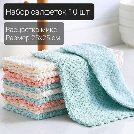 Набор салфеток для кухни из микрофибры 25х25см идеально подходит для любых задач по уборке в доме. Многоразовые плотные салфетки с коротким ворсом отлично подойдут для мытья окон, стекол и зеркал без разводов. Тряпочки подходят для уборки кухни, для стола и посуды. Универсальные обладают высокими антистатическими свойствами: микрочастицы пыли и грязи имеют отрицательную полярность, а микроволокна (из которых состоит наша салфетка) – положительную, что создает эффект притяжения. Тряпка хозяйственная предотвращает накопление пыли и микробов на поверхностях, что обеспечивает гигиеническую чистоту. Набор тряпок для кухни легко моется и не выцветает, что значительно упрощает процесс уборки. Салфетки автомобильные имеют антибактериальный состав, что предотвращает наличие неприятного запаха при покупке и в процессе эксплуатации. Набор из 10 салфеток обеспечивает достаточный запас для регулярной уборки и экономии времени.