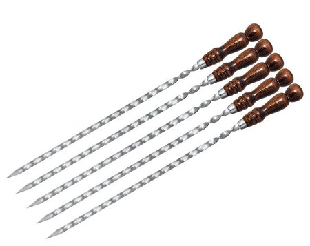 Шампур из нержавеющей стали. На поверхности каждого шампура нанесён ромбовидный узор, придающий ему неповторим стиль. Ручки изготовлены из бука и покрыты огнестойким лаком. Характеристики одного шампура: Рабочая длина шампура: 540 мм Длина рукояти: 160 мм Общая длина шампура: 700 мм Ширина стали: 12 мм, Толщина: 3 мм. Количество шампуров: 5 штук.
