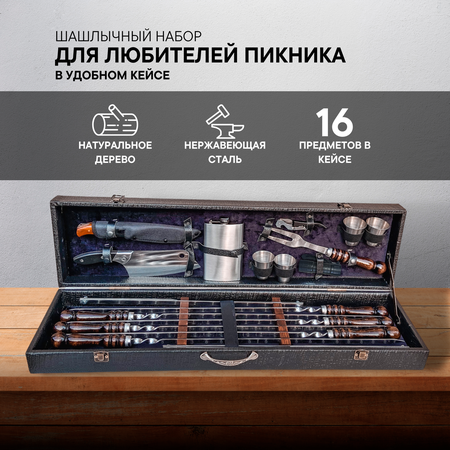 шампура с деревянной ручкой - 6 шт.; складной мангал-таганок - 1 шт.; открывашка-штопор - 1 шт.; вилка для мяса- 1 шт.; тяпка топорик для мяса - 1шт.; нож кизлярский в ножнах - 1 шт.; фляжка 300 мл - 1 шт, стаканчики стопки - 4 шт.; кейс