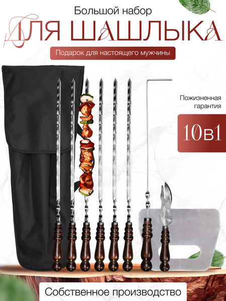 Вы и ваша семья любите проводить время на свежем воздухе и готовить ароматные блюда на мангале? Тогда этот набор шампуров идеально подойдет для вас! Набор шампуров подарочный 10 в 1 в чехле из нержавеющей стали обеспечит вам комфорт и удовольствие во время приготовления шашлыка и других блюд. Подарочный набор шампуров включает в себя: Чехол из плотной водоотталкивающей ткани Опахало для углей Кочерга для углей 6 шампуров с деревянной ручкой Нож 6 в 1 Набор шампуров в чехле станет отличным подарком для вас или ваших близких, как на день рождения, 23 февраля так и Новый год! В нем есть все необходимое для приготовления вкусных блюд на огне!