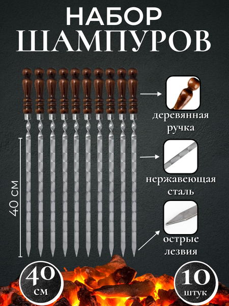 Шампура из нержавеющей стали и деревянной ручкой из бука с колечком на конце, ручка покрыта несколькими слоями качественного, огнестойкого лака. Характеристики одного шампура: Рабочая длина шампура: 40 см. Длина рукояти: 16 см. Общая длина шампура: 65 см. Ширина стали: 12 мм, Толщина 2.5 мм. Количество шампуров в упаковке 10 штук.