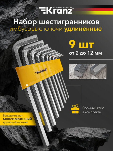 Набор ключей имбусовых KRANZ с шаровым наконечником и удлиненной рукояткой предназначен для работы с крепежом, оснащенным шлицом HEX (шестигранником). Ключи имеют Г-образную форму, изготовлены из высококачественной стали. Антикоррозийное покрытие обеспечивает надежную защиту инструмента от негативных внешних воздействий. Это значительно продлевает срок службы. Набор содержит 9 ключей с размерами от 2 до 12 мм. Этого достаточно для работы с большинством видов крупногабаритного крепежа, используемого в бытовой и промышленной технике. Ключи изготовлены из углеродистой стали, оксидированы. Твердость рабочей части составляет 48-50 HRС. Это обеспечивает высокую прочность и износостойкость инструмента. Для удобства хранения ключи поставляются в пластиковом чехле. Это позволяет легко и быстро найти нужный ключ. Набор ключей имбусовых KRANZ с шаровым наконечником и удлиненной рукояткой используется для следующих целей: Монтаж и демонтаж мебели Ремонт бытовой техники Сборка и разборка электроприборов Другие работы, требующие использования крупногабаритного крепежа с шестигранным шлицем Достоинства: Надежность: ключи изготовлены из хромованадиевой стали. Твердость рабочей части составляет 48-50 HRС. Удобство: ключи имеют Г-образную форму, что обеспечивает удобный захват. Шаровой наконечник позволяет работать в труднодоступных местах. Удлиненная рукоятка обеспечивает больший рычаг, что облегчает работу с крепежом, расположенным в труднодоступных местах. Для удобства хранения ключи поставляются в пластиковом чехле. Широкий диапазон размеров: набор содержит 9 ключей с размерами от 2 до 12 мм. Набор ключей имбусовых KRANZ с шаровым наконечником и удлиненной рукояткой - это надежный и удобный инструмент, который будет незаменим в любом доме или мастерской. Он позволит быстро и легко выполнять работы, требующие использования крупногабаритного крепежа с шестигранным шлицем, расположенного в труднодоступных местах.