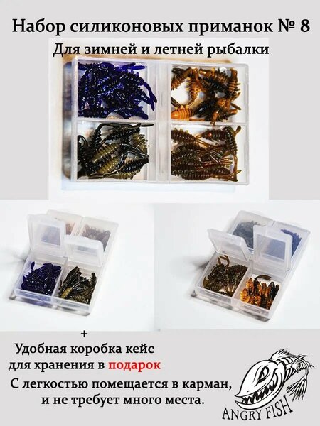 Набор из силиконовых приманок в состав которой внедрен аттрактант на базе натуральных органических экстрактов и соли. Приманки различного цвета не окрашивают друг друга и соответственно их можно хранить в одной коробке. Все изделия абсолютно устойчивы к ультрафиолету и нагреву солнечных лучей. для микроджига наноджига мормышинга, зимней рыбалки, летней рыбалки.