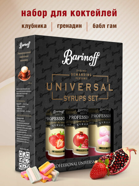 Набор сиропов Barinoff для коктейлей и лимонадов: Бабл Гам, Клубника, Гренадин Откройте для себя новые вкусы и ароматы с набором сиропов Barinoff. В комплект входят три сиропа с яркими вкусами: Бабл Гам, Клубника и Гренадин. Сиропы Barinoff подходят для использования в десертах, выпечке, кондитерских изделиях, а также для приготовления коктейлей, кофе и чая. Они придадут вашим напиткам и десертам неповторимый вкус и аромат. Набор сиропов Barinoff упакован в индивидуальную коробку, что делает его отличным подарком для бариста, кофемана или просто любителя вкусных напитков. Сиропы Barinoff изготовлены из натуральных ингредиентов, таких как сахар, вода, концентрированные фруктовые соки и ароматизаторы. В составе сиропов нет глютена, белка и жира, а содержание углеводов составляет 64 г на 100 г продукта. Срок годности набора сиропов составляет 1095 дней, а срок потребления – 14 дней. Выбирайте набор сиропов Barinoff для коктейлей и лимонадов и наслаждайтесь разнообразием вкусов и ароматов!