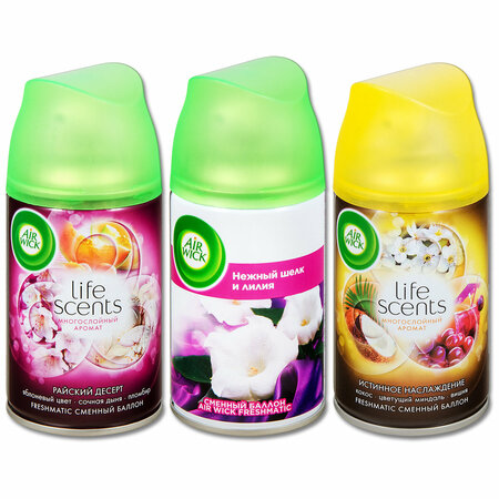 Набор из 3-х сменных баллонов для автоматического освежителя воздуха AirWick Freshmatic с самыми популярными ароматами "Райский десерт", "Нежный шелк и лилия" и "Истинное наслаждение". Сменный флакон используется в автоматическом диспенсере Air Wick Freshmatic для устранения неприятных запахов и создания комфортной атмосферы с помощью приятных вам ароматов. Освежитель Air Wick можно использовать как у себя дома, так и в офисах, магазинах, ресторанах, общественных зданиях для устранения запахов в туалетах и ванных комнатах, помещениях для курения, кухнях и т. п. Одного аэрозольного спрея Airwick достаточно для поддержания аромата до 70 дней в одной комнате. Точное время использования ароматизатора зависит от настроек интенсивности распыления, установленных на освежителе Air Wick Freshmatic. Покупка нескольких баллонов в комплекте позволяет сэкономить до 30% от стоимости одного флакона.
