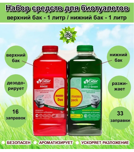 состав набора: жидкость для верхнего бачка для дезодорации и эффективного смыва в переносных бытовых биотуалетах Rinse,1 л - 1шт, средства для химической обработки и дезодорации отходов в нижних баках портативных биотуалетов, а также уличных кабинах, септиках, выгребных ямах и туалетных ведрах Eco Green,1 л - 1шт