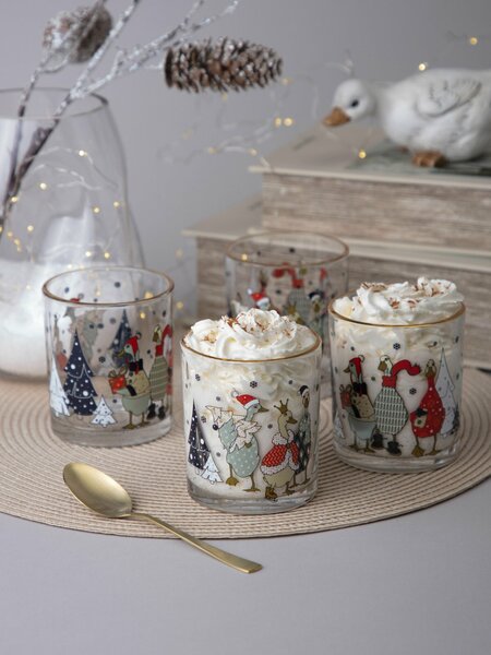 Подарочный набор состоит из 4х стеклянных стаканов. Каждый бокал из набора имеет объём в 310 мл, диаметр 8 см и высоту 9 см. Стекло экологично и безопасно для пищевых продуктов. Эти прозрачные бокалы с рисунком отлично подойдут для подачи прохладительных напитков: воды, сока, морса, лимонада и компота. К тому же эти оригинальные праздничные стаканы с декором можно использовать и для алкогольных напитков и даже для трайфлов. Мы уверены, что такие стильные фужеры с принтом порадуют любого. Серия Family Christmas является праздничной посудой и продолжением нашей легендарной коллекции Family Farm. Всеми любимая и знакомая компания забавных гусей на этот раз готовится к встрече главного праздника года. Новогодние подарки, ёлки, гирлянды, тёплые шарфики и шапочки, и даже коньки теперь украшают наших весёлых пернатых. Основная часть серии состоит из фарфоровых изделий: обеденные и закусочные тарелки, сервировочные блюда, салатники, разнообразные кружки и чайные пары. Идеальный вариант сервировки стола как на праздник, так и на каждый день. Коллекция выполнена в двух классических цветах: красном и синем. Серия создана для того, чтобы за новогодним столом заставить улыбнуться даже самого серьезного члена Вашей семьи. Все предметы коллекции поставляются в коробках с рисунками. Это позволяет дарить их с большим удовольствием на любой праздник, будь то день рождения, юбилей, свадьба, 8 марта, знак внимания любимой женщине, и конечно же, будут замечательным подарком на Новый год и Рождество. Наша новогодняя коллекция послужит художественным оформлением Вашего праздничного стола, эта посуда с весёлыми новогодними мотивами украсит и прекрасно впишется в любой интерьер. Мы делимся с Вами частичкой этой новогодней атмосферы, чтобы принести в Ваш дом уют и праздничное настроение. Ведь так приятно будет угощать родных и близких с нашей красивой посудой из китайского фарфора и стекла.