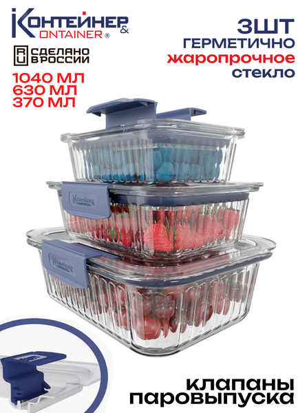 Набор стеклянных герметичных контейнеров 3 шт от бренда Контейнер&Container объемом 1040, 630 и 370 мл, с уникальным дизайном защелок. Используйте контейнер без опасений, ведь стекло, из которого он сделан, полностью термостойкое и сохраняет свежесть продуктов на долго. Контейнеры имеют вместительность 1040 мл, 630 мл и 370 мл, что делает их достаточно удобным, чтобы хранить продукты в доме или брать с собой. Стенки стеклянного контейнера имеют достаточную толщину, чтобы избежать появления трещин при падении с небольшой высоты. Этот замечательный контейнер также можно использовать для заморозки продуктов. Это отличное решение для сохранения свежести и качества пищи на долгий срок. Кроме того, этот стеклянный контейнер оснащен удобными клапанами паровыпуска на крышке. Благодаря им можно разогревать еду в СВЧ печи, не снимая крышки, просто поднимите защелки до щелчка и поставьте контейнер в микроволновую печь. А защелки на крышке надежно фиксируют контейнер, предотвращая возможные проливы или потерю вкуса, делая контейнер герметичным. Крышка изготовлена из пищевого полипропилена (РР), который не содержит Бисфенол-А (BPA free). Дайте этому контейнеру возможность стать вашим верным спутником в хранении пищи. Откройте для себя все его удобства и преимущества, которые он принесет в вашу повседневную жизнь. Жаропрочное стекло, из которого изготовлена емкость для хранения, позволяет использовать её, как форму для запекания и сервировок горячих блюд на столе. Красивый дизайн ёмкости, а именно волнообразный дизайн, делает контейнер еще более интересным решением для Вашего праздничного стола. Перед использованием В духовке обязательно снять крышку. Важно подчеркнуть обязательные ключевые характеристики контейнера для еды: жаропрочный, герметичный, подходит для заморозки, для мытья в посудомоечной машине, для разогрева в СВЧ-печи и даже для запекания в духовке (без крышки). Изготовлен из боросиликатного стекла, а крышка из безопасного полипропилена, крышка имеет клапаны паровыпуска и защелки. В набор входит 3 контейнера: 1 стеклянный контейнер объемом 1040 мл, 1 стеклянный контейнер объемом 630 мл, 1 стеклянный контейнер объемом 370 мл и пластиковая крышка с защелками на каждый контейнер. Размеры контейнера см. на 3 фото.