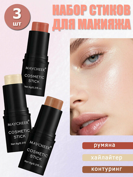 Идеальный набор для женщин и девушек Стики для макияжа из maycheer - хайлайтер, контуринг, румяна, тени, помада в формате толстого карандаша 3 в 1 для лица, для губ, для щек, для глаз. Стик-румяна - это многофункциональный продукт для контуринга и скульптурирования лица одним движением придаст коже свежий и сияющий вид. Нежная текстура румян для макияжа равномерно распределяется, быстро фиксируется на поверхности лица, поддается растушевке, что позволяет добиться максимально естественного финиша. Светоотражающие микрочастицы жидких румян придают эффект здоровой упругой кожи. Кремовые румяна стик для лица очень удобны, можно использовать не только для щек, но и для век, и для губ. Кремовые румяна в стике объединяют в себе несколько средств, что делает их по-настоящему универсальными. Румяна можно использовать как помаду, как тени для век кремовые и как румяна.