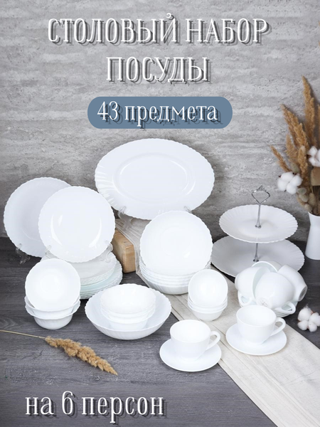 Сервиз столовый 43 предмета из стеклокерамики белого цвета коллекции Tulip сочетает в себе простоту и стиль. Характерная особенность обеденного сервиза коллекции Tulip - округлая и рифленая форма бортика, которая прекрасно впишется в любой стиль оформления столовой. Минималистичный простой дизайн, крепкая универсальная стеклокерамика, удобный состав набора - всё необходимое для сервировки праздничного стола "под ключ" в одном столовом сервизе на 6 персон. Комплектация: салатник 1000 мл (диаметр 20 см, высота 5 см) - 1 штука , десертные тарелки 19 см - 6 штук, суповые глубокие тарелки 650 мл (диаметр 17,5 см, высота 5 см) - 6 штук, обеденные тарелки 21,5 см - 6 штук, блюдо сервировочное 30х22 см - 1 штука, салатники 300 мл - 6 штук, розетки 120 мл - 4 штуки, чашки чайные 220 мл -6 штук, блюдца - 6 штук фруктовница - 1 штука. Благодаря универсальной форме тарелок набор белой посуды идеально подходит для домашнего использования и профессиональной деятельности в столовой или ресторане. Прекрасно подойдет как для праздничного, так и для повседневного стола. Гладкая структура посуды позволяет тщательно промыть остатки еды, исключая размножение бактерий. Посуду можно использовать для хранения и разогревания блюд, но нужно помнить, что сервиз не любит резких перепадов температур. Набор белой посуды 43 предмета можно мыть в посудомоечной машине. Комплект посуды на 6 персон имеет сертификаты качества из России и выполнен из экологичных материалов. Данный набор белой посуды - основа для любой кухни по доступной цене!