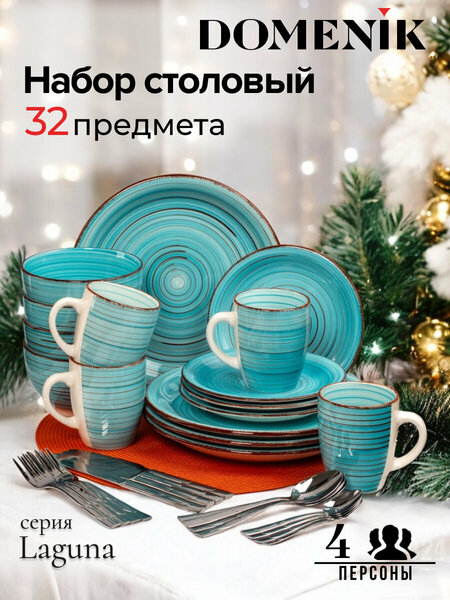 Набор столовый Domenik LAGUNA на 4 персоны, 32 предмета - это высококачественный и стильный сервиз, который станет отличным дополнением к вашему столу. Сервиз выполнен в голубом цвете, что придает ему свежесть и легкость. В комплект входят 32 предмета, включая 4 обеденных тарелок, 4 кружки, 4 десертные тарелки, 4 салатника, 4 вилки, 4 ножа, 4 обеденные ложки, 4 чайные ложки. Это позволяет сервировать стол для 4 персон. Сервиз изготовлен из керамики, что гарантирует его прочность и долговечность. Материал не впитывает запахи и легко моется. Сервиз подходит для использования в микроволновой печи и посудомоечной машине, что значительно облегчает его уход и экономит ваше время. Форма тарелок круглая, что делает их удобными для подачи различных блюд. Выбирая набор столовый Domenik LAGUNA, вы получаете стильный и функциональный сервиз, который будет радовать вас и ваших гостей своим качеством и удобством использования.