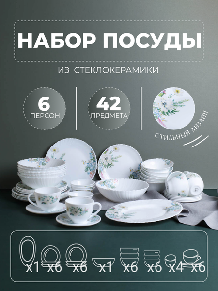 Представляем вам изысканный набор столовой посуды (сервиз), изготовленный из высококачественной стеклокерамики. Этот набор станет идеальным выбором для создания элегантной и утончённой атмосферы за вашим столом, будь то повседневный ужин или торжественное мероприятие. В комплект входит набор тарелок, набор салатников, пиалы, блюда, блюдо, чайный набор, включающий в себя чашки и блюдца. Данный набор посуды идеально подойдет для сервировки стола В нашем наборе: - 6 десертных тарелок 19 см - 6 обеденных тарелок 21,5 см - 4 пиалы 9 см, объёмом 120 мл - 6 салатников (суповых тарелок) 17,5 см, объёмом 650 мл - 6 салатников (суповых тарелок) 15,5 см, объёмом 480 мл - 1 блюдо 30 × 21,5 см - 1 салатник 20 см, объёмом 1 литр - чайный набор (6 чашек, 6 блюдец) Набор посуды из стеклокерамики подходит как для повседневного использования, так и для особых случаев. Не упустите возможность создать неповторимую атмосферу за столом с помощью нашего изящного набора посуды.