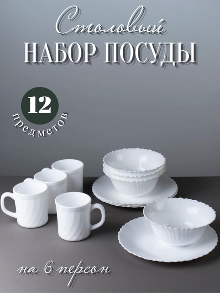 Сервиз столовый из стеклокерамики белого цвета сочетает в себе простоту и стиль. Минималистичный простой дизайн, крепкая универсальная стеклокерамика, удобный состав набора - всё необходимое для ежедевной сервировки стола. Комплектация набора столовой посуды на 4 персоны из 12 предметов: обеденные тарелки 21,5 см - 4 штуки, для подачи горячих блюд; глубокие тарелки 550 мл (диаметр 15,5 см, высота 6,5 см) - 4 штуки, в них можно подавать как первые блюда, так и кашу и салаты порционно; кружки 250 мл - 4 штуки. Благодаря универсальной форме тарелок набор белой посуды идеально подходит для домашнего использования и профессиональной деятельности в столовой или ресторане. Прекрасно подойдет как для праздничного, так и для повседневного стола. Гладкая структура посуды позволяет тщательно промыть остатки еды, исключая размножение бактерий. Использовать посуду в микроволновой печи и посудомоечной машине возможно. Но учитывайте, что посуда не переносит резкого перепада температур. Не грейте в микроволновке слишком долго при больших температурах. Мойте в посудомоечной машине в деликатном режиме. Комплект посуды на 6 персон имеет сертификаты качества из России и выполнен из экологичных материалов. Данный набор белой посуды - основа для любой кухни по доступной цене!