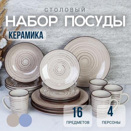 Набор столовой посуды на 4 персоны Классик / 16 предметов керамика бежевый с черным кантом
