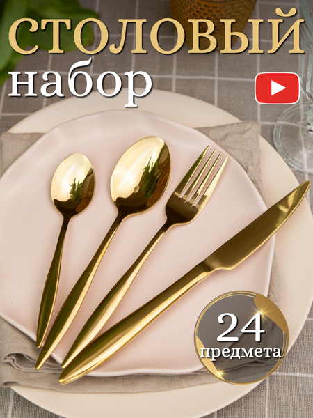 Набор столовых приборов золото "Капля" - это изысканный выбор для тех, кто ценит качество и стиль. В комплект входит 24 предмета, что позволяет сервировать стол на 6 персон.